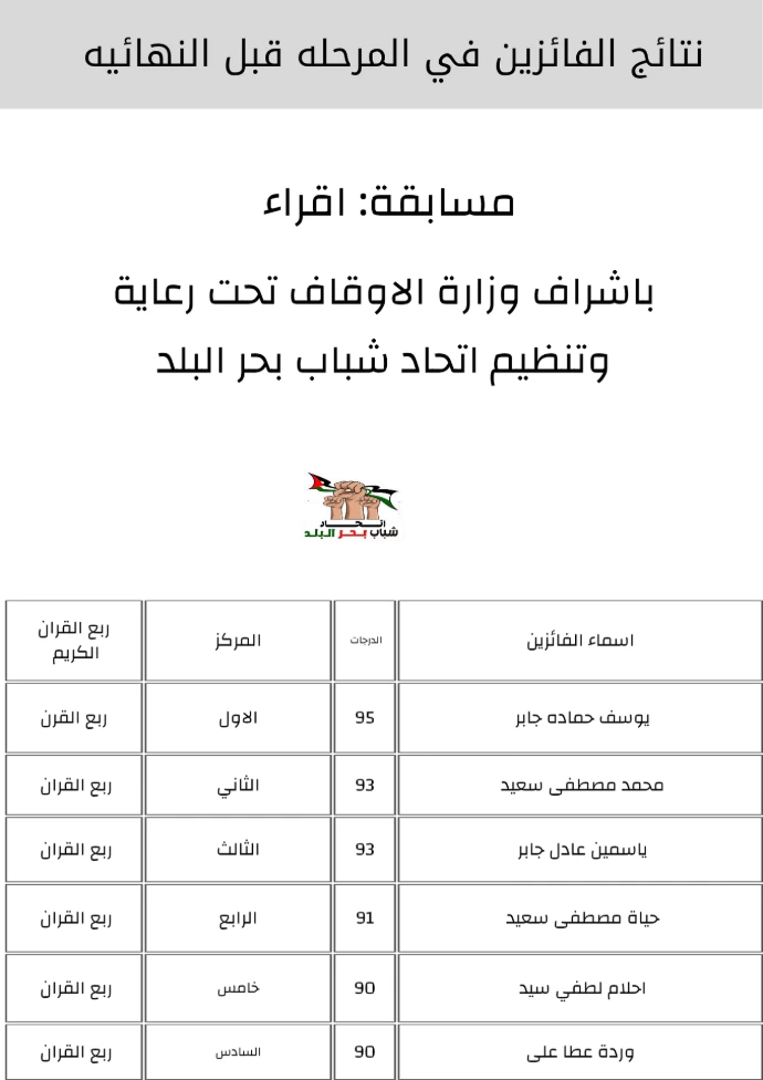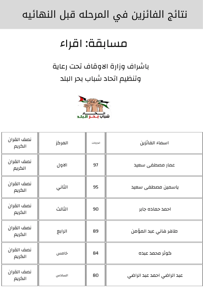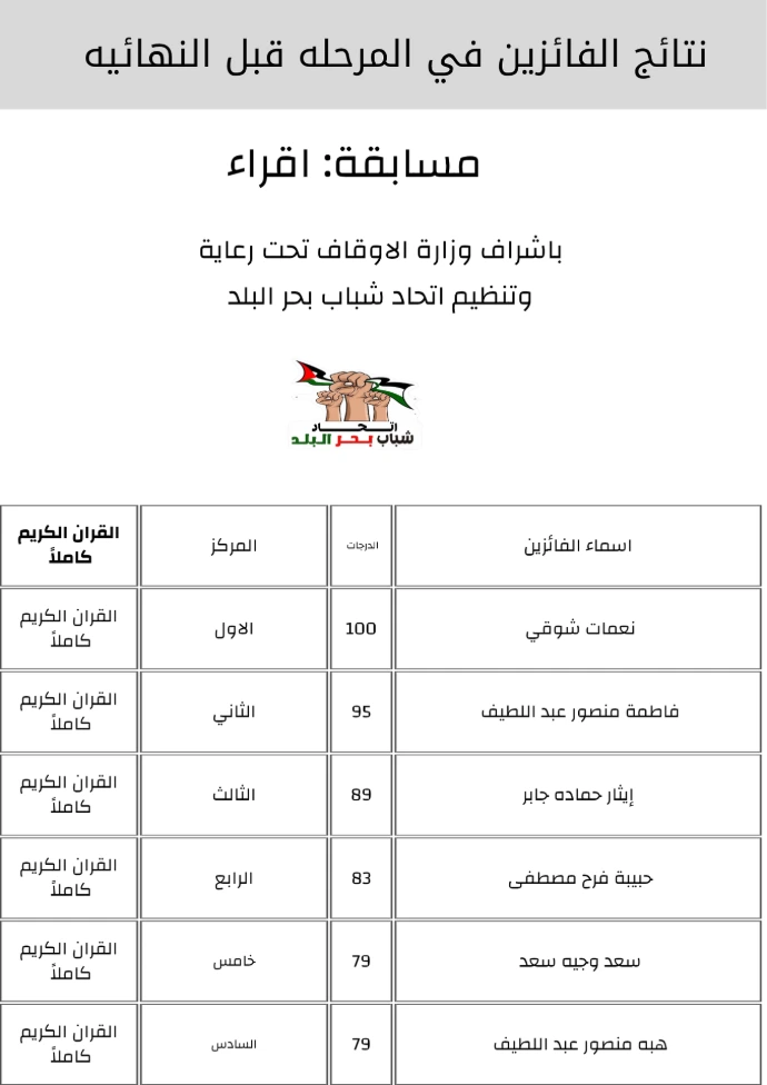 نتائج مرحلة ما قبل النهائي مسابقه اقراء تحت اشرف وزارة الاوقاف. برعاية وتنظيم اتحاد شباب بحر البلد